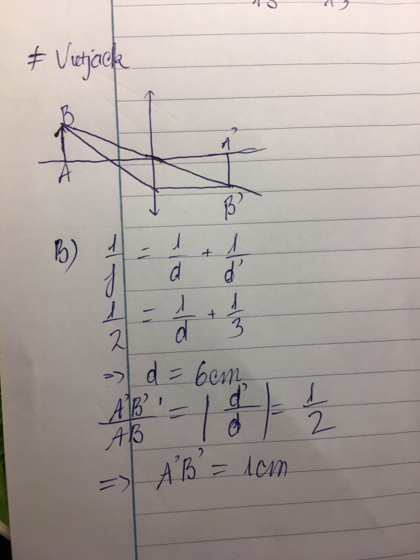 Bài 2 : Đặt Vật AB cao 2cm vuông góc với trục chính của thấu kính hội tụ và cách thấu kính 6cm, thấu kính có tiêu cự 2cm.