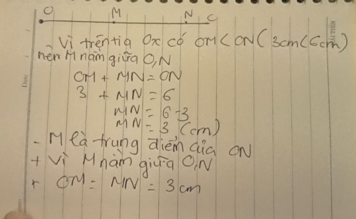 => OM + MN = ON => MN = ON - OM = 6 - 3 = 3(cm) = OM = 3 cm => M là trung điểm của đoạn ON