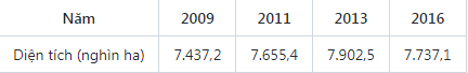 Bảng: Tổng diện tích đất trồng lúa của Việt Nam từ 2009 đến 2016 (đơn vị: nghìn ha )