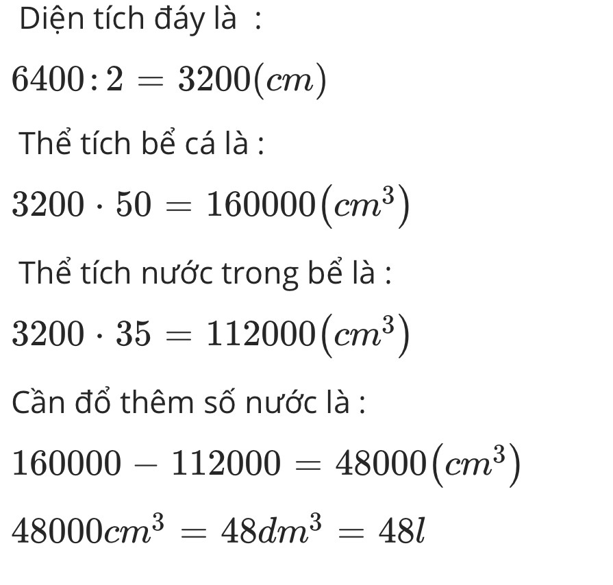 Một bể cá hình hộp chữ nhật cao 50cm.Diện tích đáy bằng nửa diện tích xung quanh.Trong bể đang có nước cao đến 35cm.Hỏi thêm bao nhiêu nước vào bể cá đó thì nước vừa đầy bể Biết diện tích xung quanh của bể cá là 6400cm²