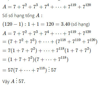 Cho A =7+7^2+7^3…+7^119+7^120. Chứng minh rằng A chia hết cho 57