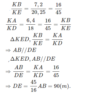 Bạn Hiển đo được khoảng cách từ vị trí mình đứng ( điểm k) đến cây D và cây E ở hai bên hồ nước lần lượt là KD = 18m và KE = 20,25m.Để tính độ dài DE,Hiển xác định điểm A nằm giữa K,D và điểm B nằm giữa K,D và điểm B nằm giữa K, E sao cho KA = 6,4m, KB = 7,2m, và đo khoảng cách giữa A và B là AB = 32m.Tính khoảng cách giữa D và E.