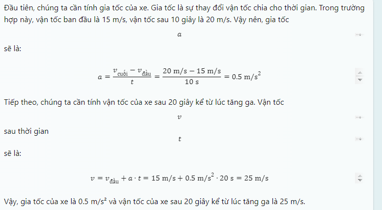 Một ô tô chạy với vận tốc 15 m/s trên đoạn đường thẳng thì người lái xe tăng ga và ô tô chuyển động nhanh dần đều.Sau 10 giây đạt đến vận tốc 20 m/s.Tính gia tốc và vận tốc của xe ô tô sau 20s kể từ lúc tăng ga