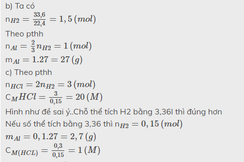 Cho một lượng bột nhôm vừa đủ vào 150 ml HCl. Phản ứng xong thu được 3.36 lít khí H2(đktc)