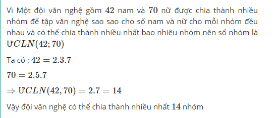 Một đội văn nghệ gồm 42 Nam và 70 nữ được chia thành nhiều nhóm để tập văn nghệ sao cho số nam và số nữ chia mỗi nhóm bằng nhau họ gọi văn nghệ đó có thể chia thành nhiều nhất bao nhiêu nhóm