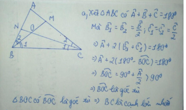 Cho tam giác ABC , các tia phân giác của góc B và C cắt tại O . trong tam giác BOC cạnh nào lớn nhất ?