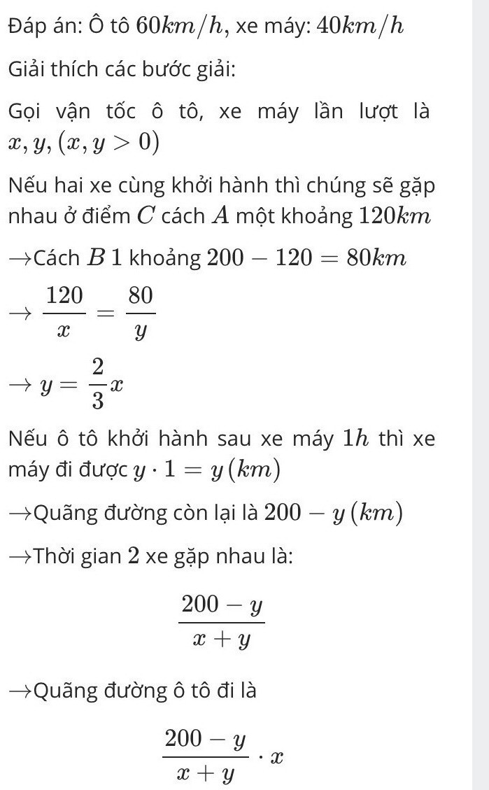 Hai địa điểm A và B cách nhau 200 km. Cùng một lúc có một ôtô đi từ A đến B . Xe máy và ôtô gặp nhau tại C cách A một khoảng bằng 120 km . nếu ôtô khởi hành sau xe máy 1 giờ thì sẽ gặp nhau tại D cách C một khoảng 24 km . Tính vận tốc xe máy và ôtô