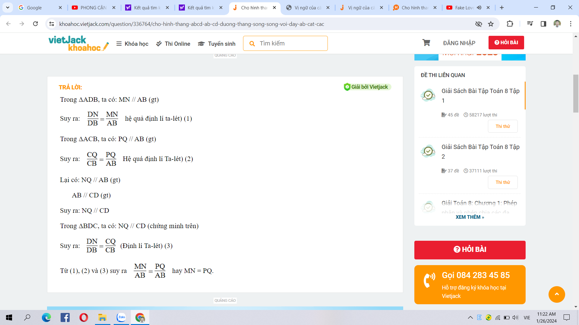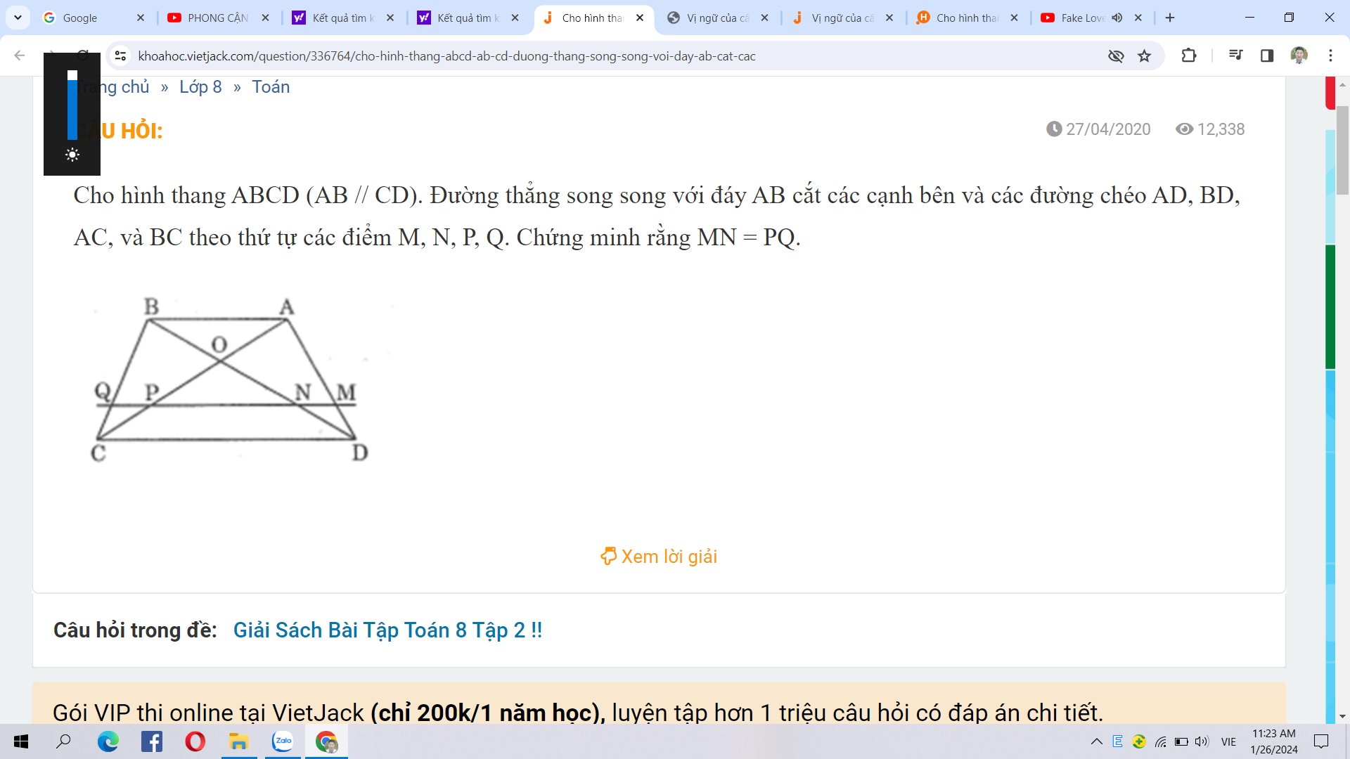 Cho hình thang ABCD (AB // CD). Đường thẳng song song với đáy AB cắt các cạnh bên và các đường chéo AD, BD, AC, và BC theo thứ tự các điểm M, N, P, Q.Chứng minh: DN/DB=CP/AC