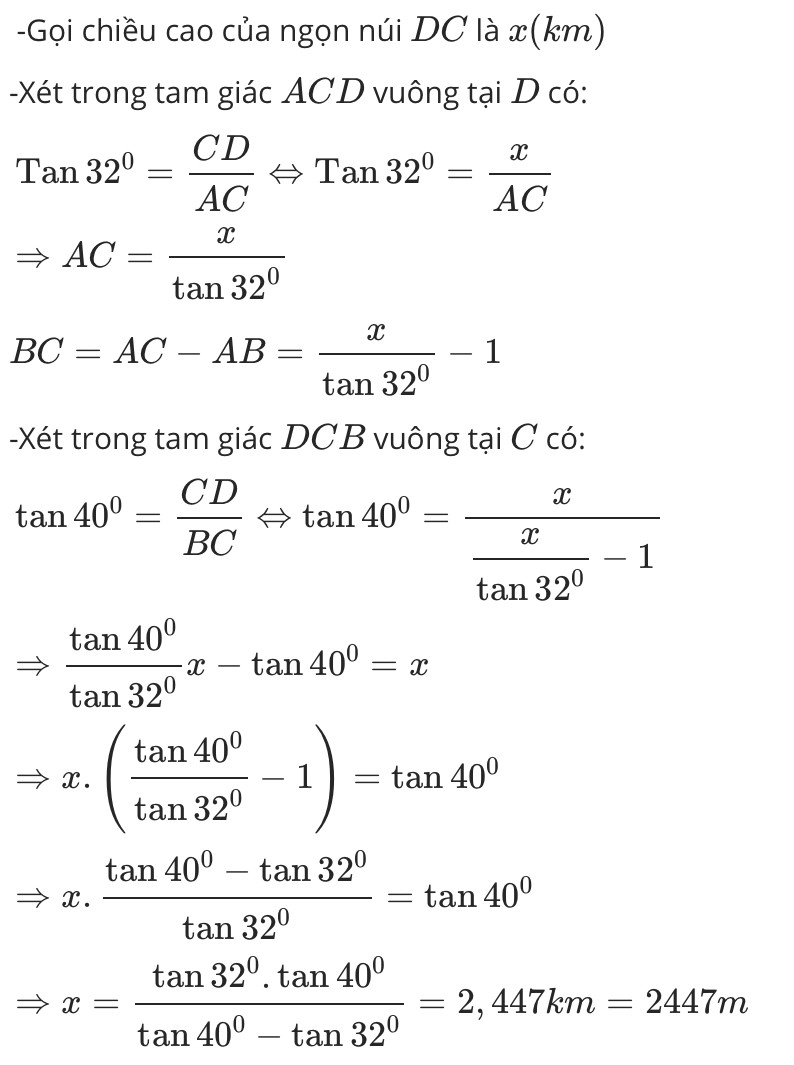 Tính chiều cao của một ngọn núi biết rằng tại hai điểm cách nhau 1km trên mặt đất, người ta nhìn thấy đỉnh núi với góc nâng lần lượt là 40độ và 32 độ