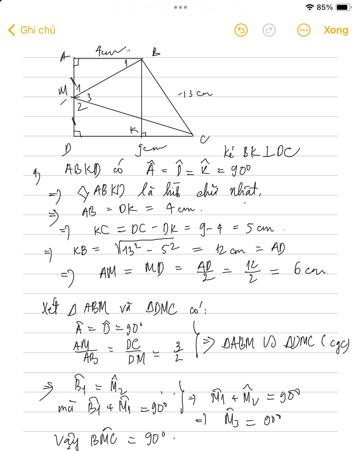 Cho hình thang ABCD(AB//CD) có góc A=góc D = 90 độ, AD=4cm, CD=9cm,DC=13cm. M là trung điểm của AD.