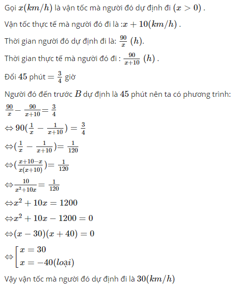 Một người dự định đi xe gắn máy từ địa điểm A đến địa điểm B cách nhau 90km. Vì có việc gấp phải đến B trước giờ dự định là 45 phút nên người ấy phải tăng vận tốc lên mỗi giờ 10 km . Hãy tính vận tốc mà người đó dự định đi