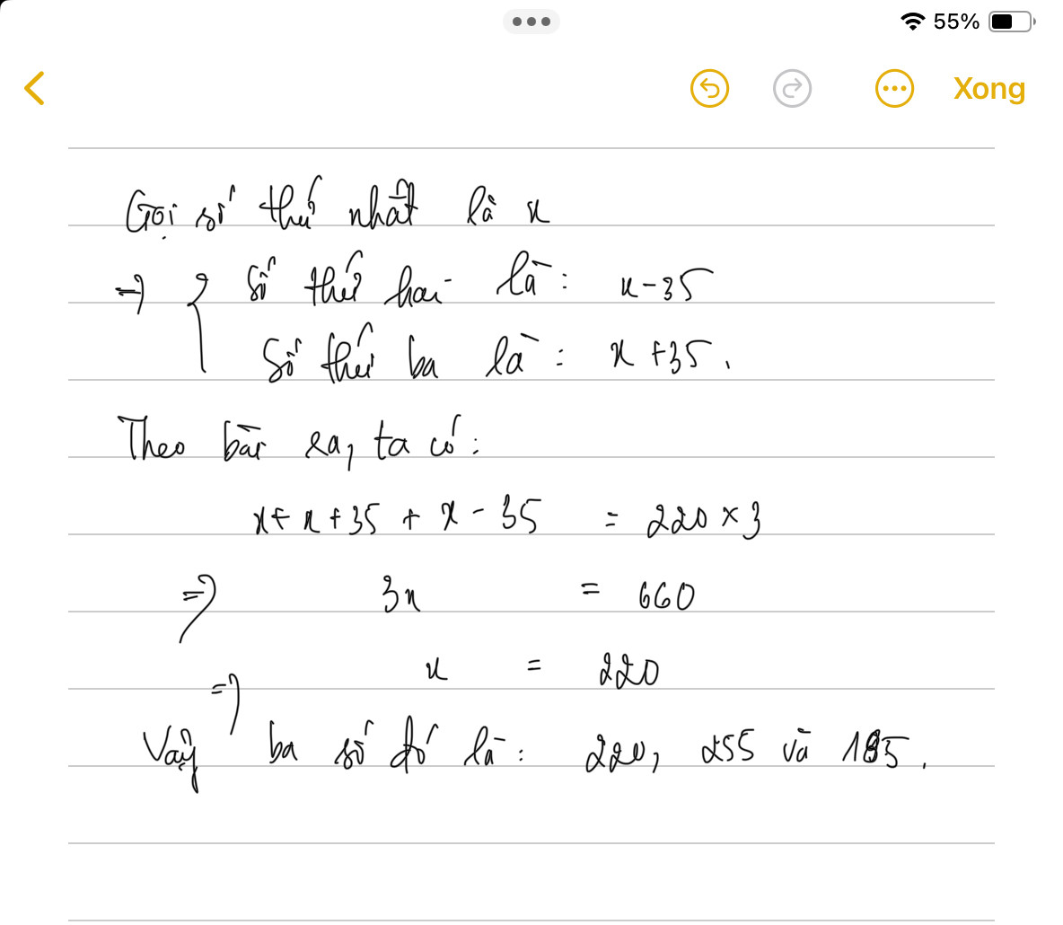 Trung binh cong của ba so bang 220. So thu nhat hon do thu hai 35 đon vi vaoem so thu ba 35 đon vi .Ba so đo la .