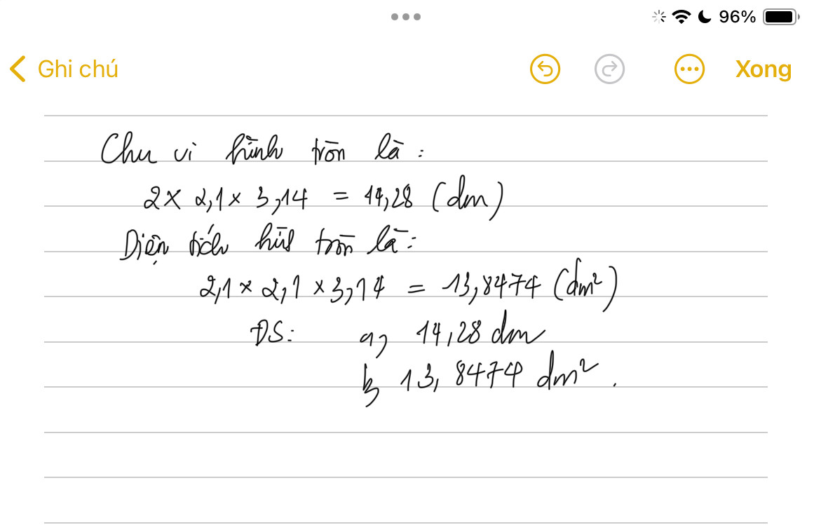 Tính chu vi và diện tích hình tròn có bán kính 2,1 dm