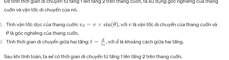 để phục vụ việc di chuyển của khách hàng giữa các tầng hàng trong siêu thị, người chủ đầu tư thường cho lắp hệ thống thang cuốn tự động. biết rằng thang cuốn có góc nghiêng là 35 độ so với phương ngang và vận tốc di chuyển là 0,6m/s, khoảng cách giữa 2 tầng liên tiếp là 4,2m. hỏi một người khi bước vào thang cuốn và đứng yên thì bao nhiêu giây để có thể di chuyển từ tầng 1 lên tầng 2?