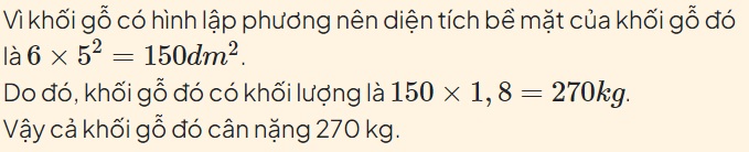 1 khối gỗ dạng hình lập phương có cạnh 5 dm. Biết 1 dm² gỗ đó cân nặng 1,8kg. Hỏi cả khối gỗ đó cân nặng bao nhiêu kg
