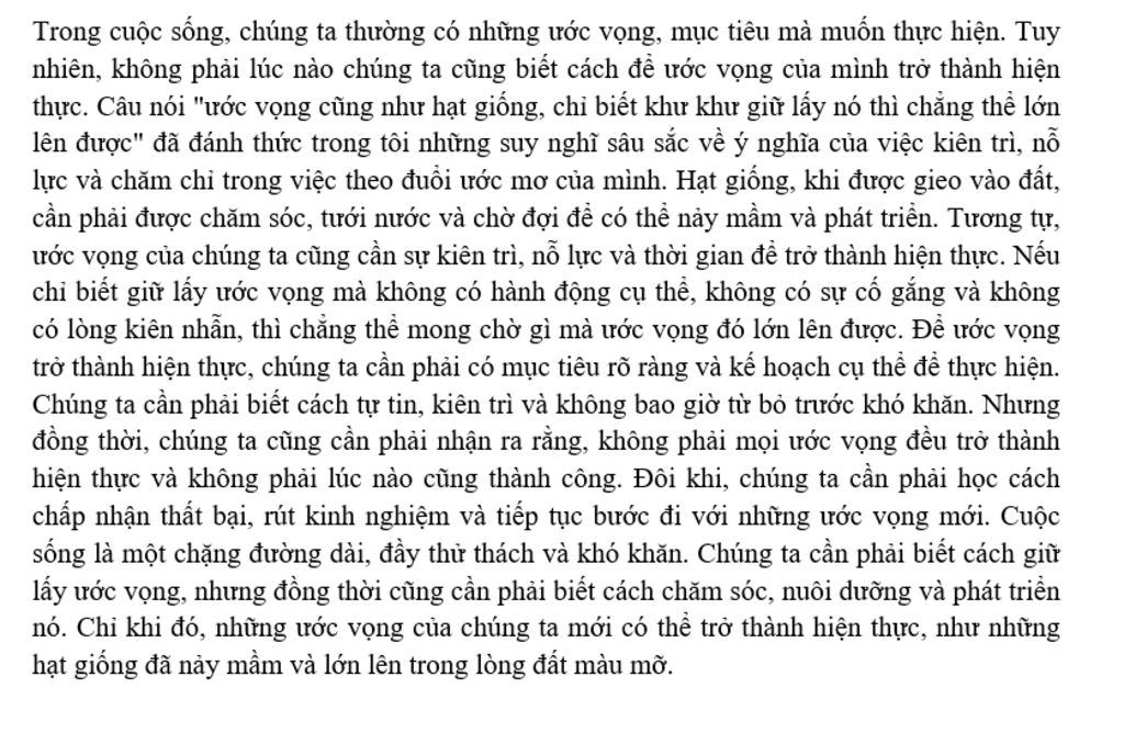 Theo suy nghĩ của tôi, ý kiến “Ước vọng cũng giống như hạt giống. Chỉ biết khư khư giữ lấy nó thì sẽ chẳng lớn lên được” thật sự mang ý nghĩa sâu sắc. Ước vọng giống như hạt giống, nếu chúng ta chỉ giữ nó trong lòng mà không hành động thì nó sẽ không thể phát triển và trở thành cây trái.