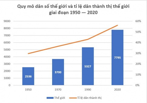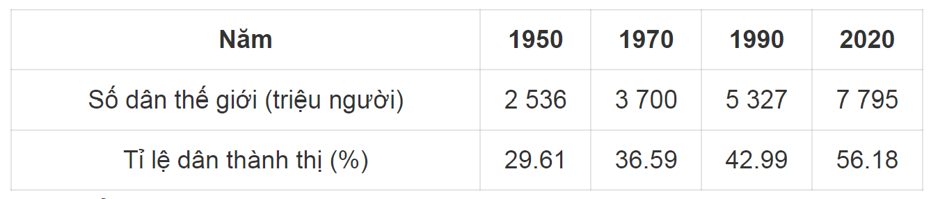 Tỉ lệ dân thành thị tăng từ năm 1950 đến năm 2020 -> 29.61% lên 56.18%