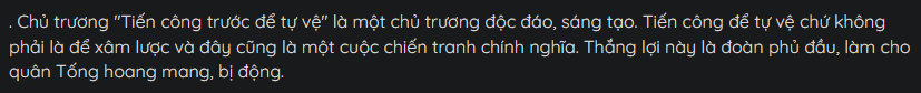 - "Tiến công trước để tự vệ" là một chủ trương độc đáo, sáng tạo. Tiến công để tự vệ chứ không phải là xâm lược. Thắng lợi này là đòn phủ đầu, làm cho quân Tống hoang mang, bị động.