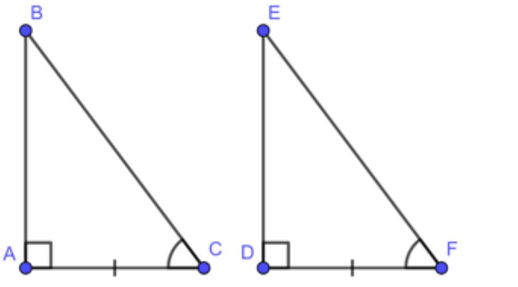Nếu một cạnh góc vuông và một góc nhọn kề cạnh ấy của tam giác vuông này bằng một cạnh góc vuông và một góc nhọn kề cạnh ấy của tam giác vuông kia thì hai tam giác vuông đó bằng nhau ( góc – cạnh – góc )