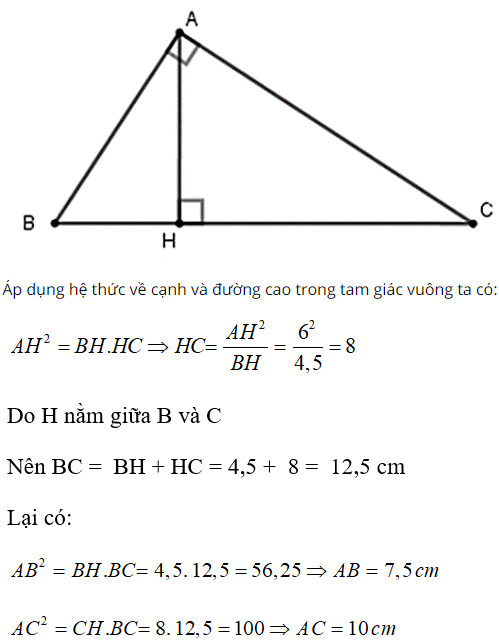 Cho tam giác ABC vuông tại A, đường cao AH. Biết AH = 6cm; BH = 4,5 cm.
