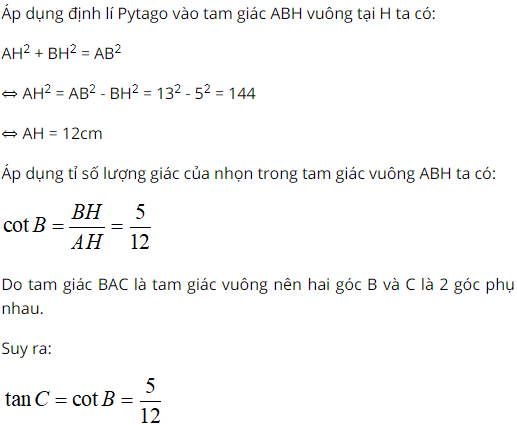 Cho ABC vuông tại A, đường cao AH. Biết AB = 13cm và BH = 5 cm. Tính tan C