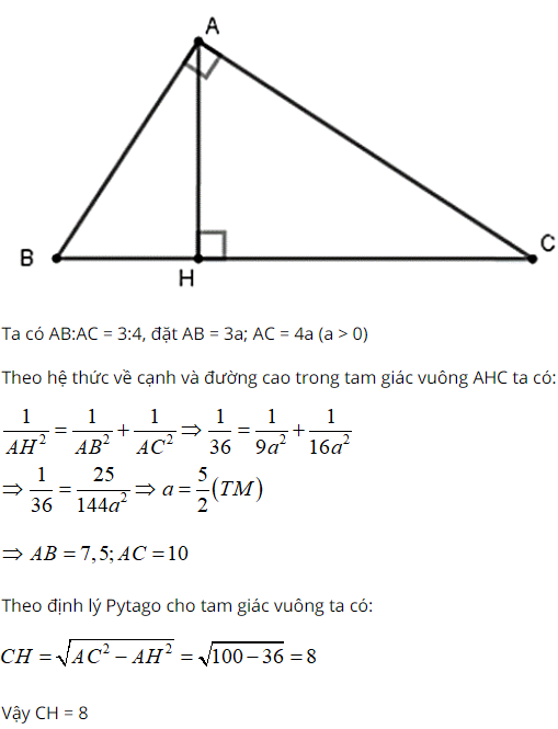 Cho tam giác ABC vuông tại A , đường cao AH . Cho biết AB:AC = 3:4 và AH = 6 cm. Tính độ dài đoạn thẳng CH