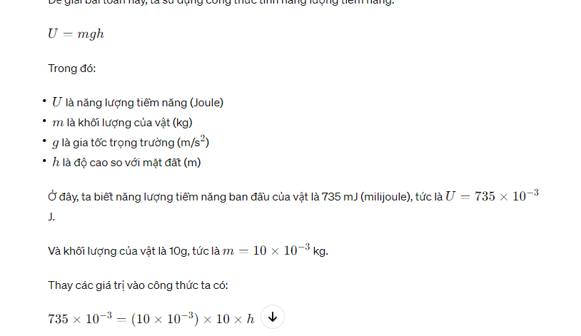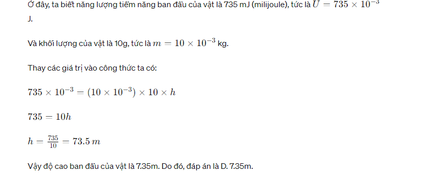 Một hòn sỏi có khối lượng 10g được thả rơi tự do từ độ cao h so với mặt đất. Bỏ qua lực cản. Chọn gốc thế năng là mặt đất. Lấy gia tốc trọng trường g=10m/s2. Thế năng ban đầu của vật là 735 mJ. Độ cao h