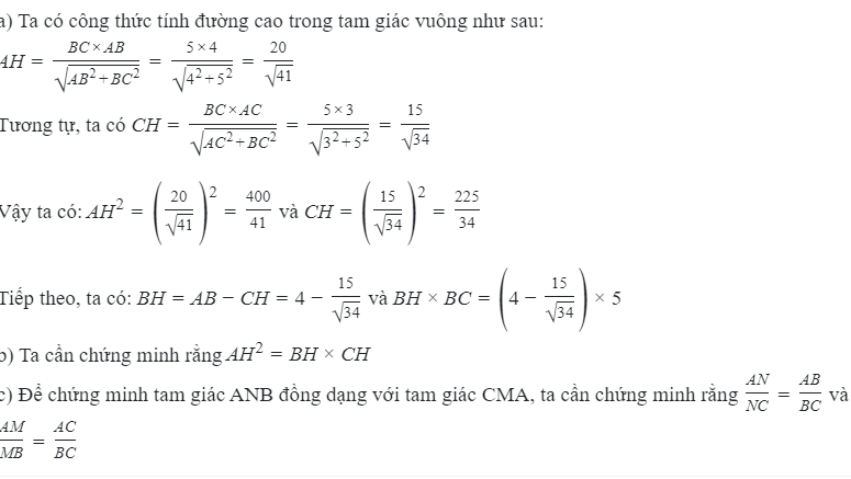 c) Để chứng minh tam giác ANB đồng dạng với tam giác CMA, ta cần chứng minh rằng \(\frac{AN}{NC} = \frac{AB}{BC}\) và \(\frac{AM}{MB} = \frac{AC}{BC}\)