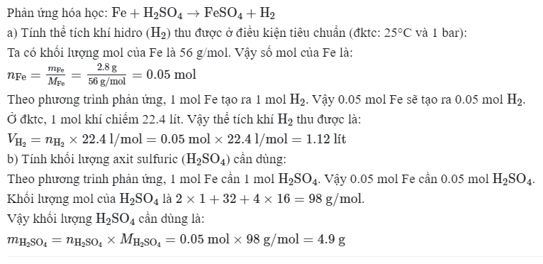 b khối lượng sulfuric acid ( H2SO4) cần dùng ? ( S=32, H=1, Fe=56) giúp tui vớii