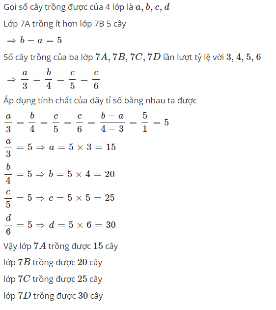 Bài 2 Bốn lớp 7A, 7B, 7C, 7D đi lao động trồng cây. Biết số cây trồng của bốn lớp 7A, 7B, 7C, 7D lần lượt tỉ lệ với 3; 4; 5; 6 và lớp 7A trồng ít hơn lớp 7B là 5 cây. Tính số cây trồng được của mỗi lớp?