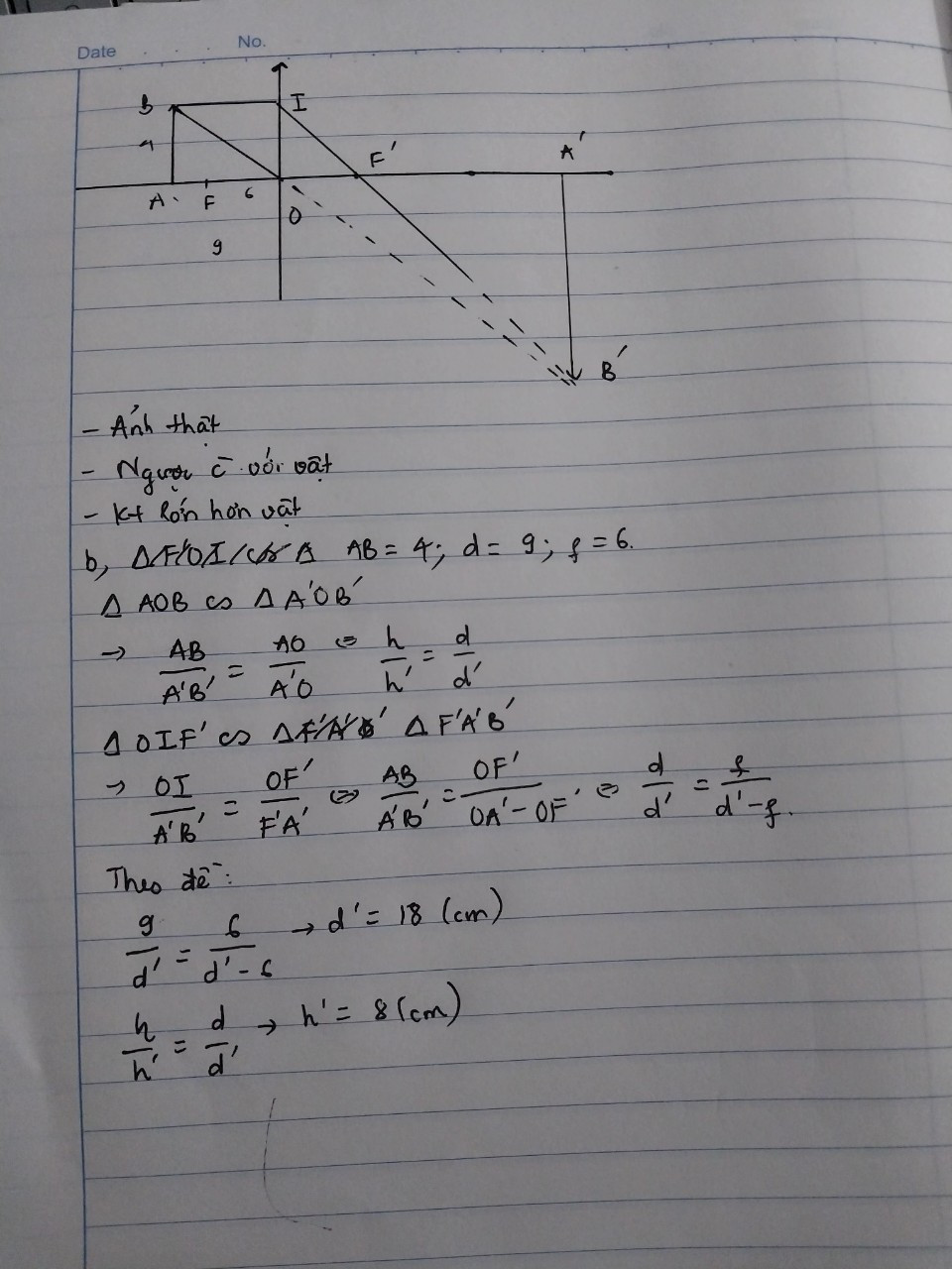 Một vật sáng AB cao 4cm đặt vuông góc với trục chính của thấu kính hội tụ có tiêu cực f=6cm. Điểm A nằm trên trục chính cách thấu kính 9cm