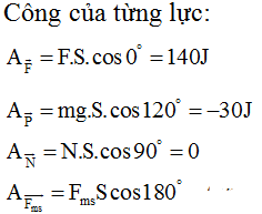 Một vật có khối lượng 3 kg được kéo lên trên mặt phẳng nghiêng một góc 30 độ so với phương ngang bởi một lực không đổi 70 N dọc theo đường dốc chính. Biết hệ số ma sát là 0,05. lấy g = 10m/s^2. Hãy xác định các lực tác dụng lên vật và công do từng lực thực hiện khi vật di chuyển được một quãng đường 2 m