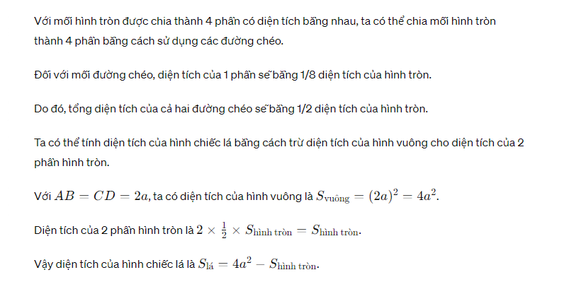 Cho hình vẽ bên biết ABCD là hình vuông có cạnh dài 2cm mỗi hình tròn có hai đường kính được chia thành 4 phần có diện tích bằng nhau tính diện tích hình chiếc lá