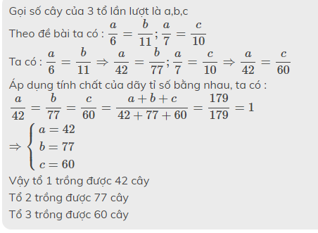 Bà tổ học sinh trồng 179 cây xung quanh vườn trường.Số cây tổ một trồng được so với tổ 2 bằng 6/11 . Số cây của tổ một trồng được so với số cây của tổ ba bằng 7/10.Hỏi mỗi tổ trồng được bao nhiêu cây