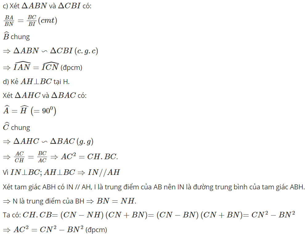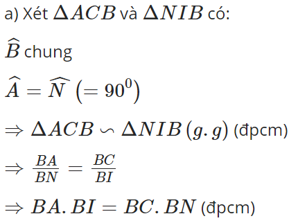 a/ Chứng minh ∆ACB đồng dạng với ∆NIB. Từ đó suy ra BA.BI=BC.BN