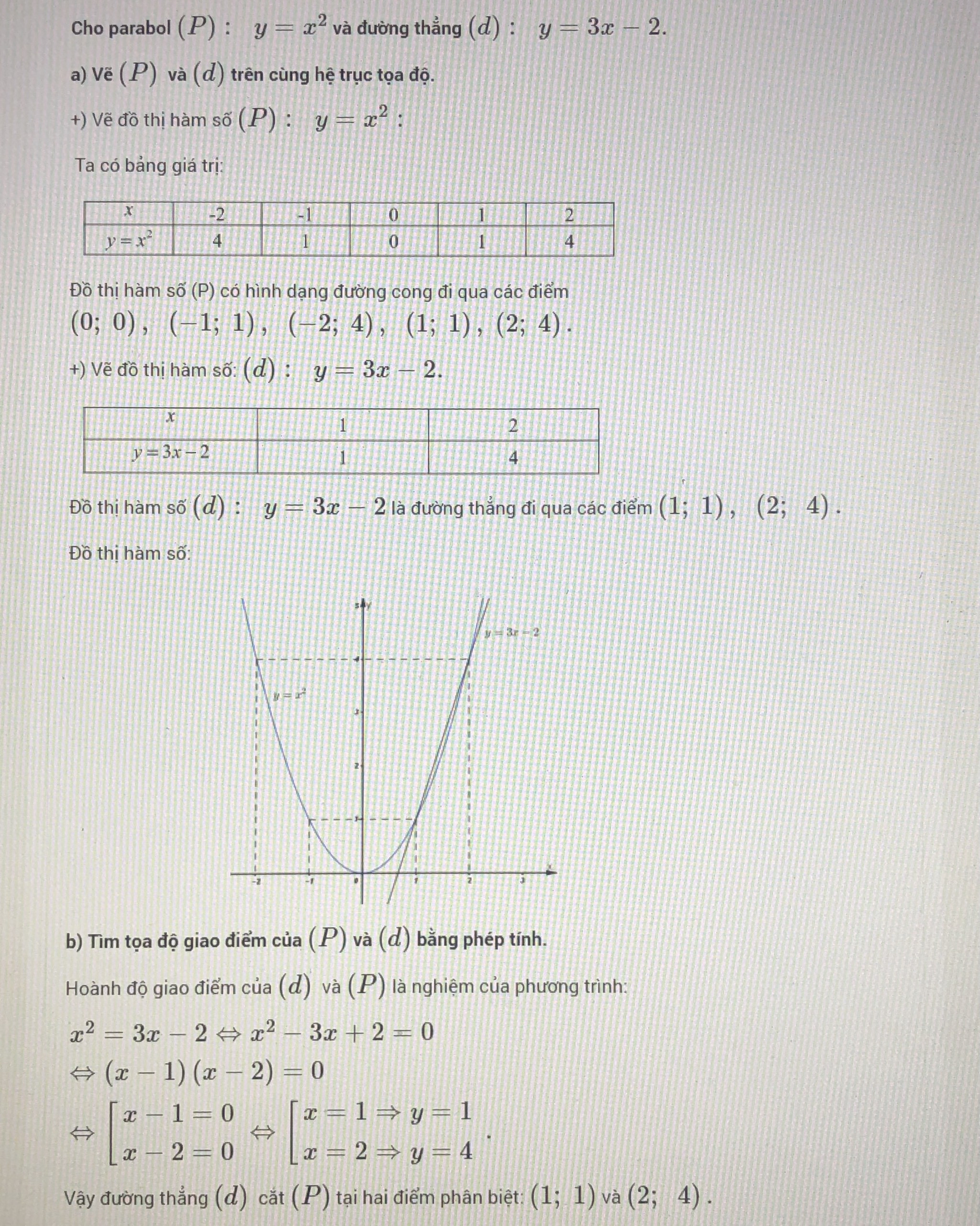 Cho (P): y=x^2 và đường thẳng (d): y=3x-2