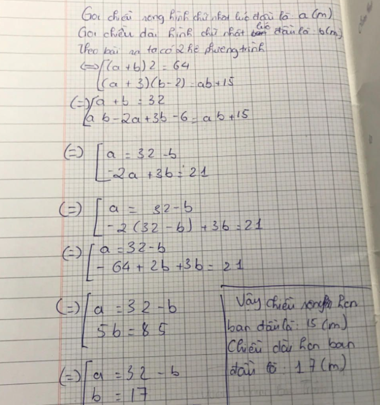 Vậy kích thước ban đầu của hình chữ nhật là chiều dài \( 20.75 \) mét và chiều rộng \( 11.25 \) mét.