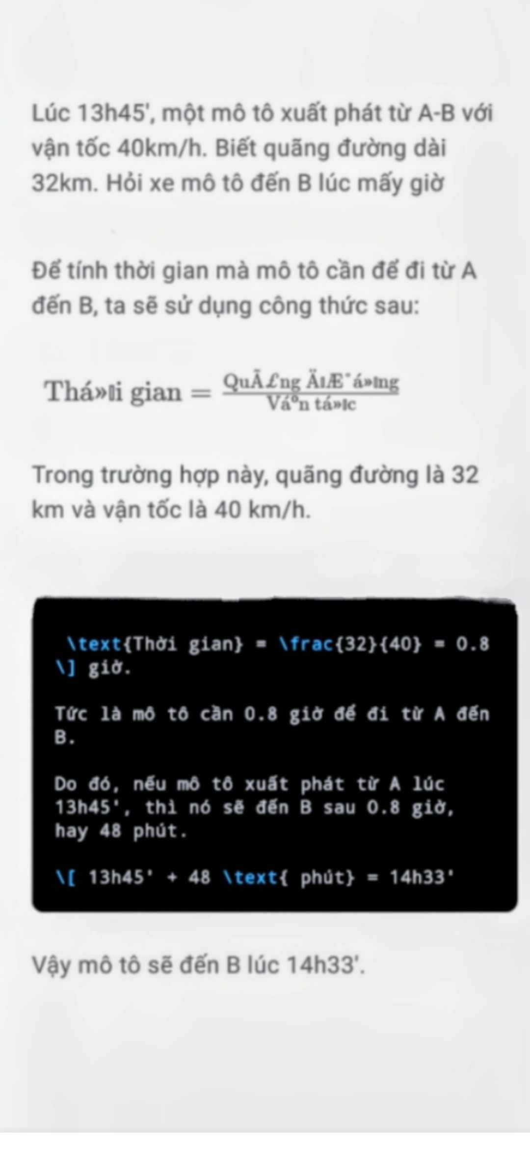 Vậy xe máy đến B lúc 14 giờ 33 phút.