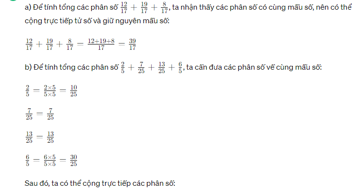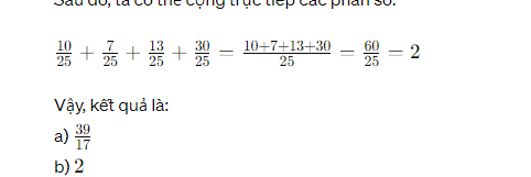 b) (2/5+6/5)+(7/25+13/25)=8/5+20/25=8/5+4/5=12/5