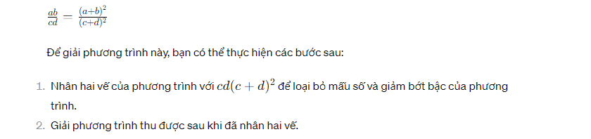 Để giải phương trình \( \frac{ab}{cd} = \frac{(a+b)^2}{(c+d)^2} \), chúng ta có thể bắt đầu bằng cách giải phương trình từng bước một.