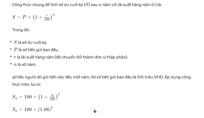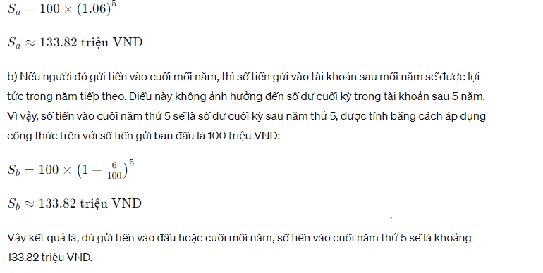 Một người có khoản thu nhập hàng năm là 100 triệu và dự định gửi 100 triệu đó vào tài khoản tiết kiệm ngân hàng trong 5 năm liên tục với lãi suất ngân hàng 6%/năm. Người đó có bao nhiêu tiền vào cuối năm thứ 5 nếu: