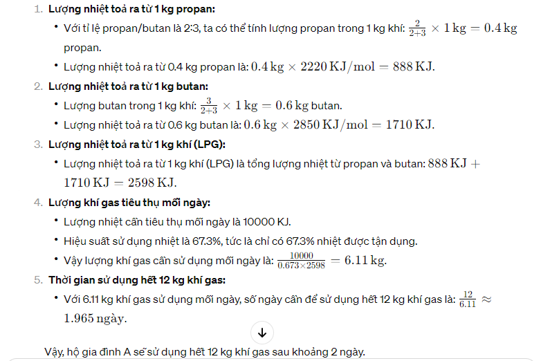 Bình gas loại 12kg sử dụng cho hộ gia đình A có chứa 12kg khí (LPG) gồm propan và butan tỉ lệ 2:3.Khi được đốt cháy hoàn toàn 1mol proban toả ra lượng nhiệt là 2220KJ,1 mol butan toả ra lượng nhiệt là2850KJ. Thành lượng nhiệt tiêu thụ từ đất khí gas 10000kJ/ngày và hiệu suất sử dụng nhiệt là 67,3%.Sau bao nhiêu ngày hộ gia đình A sài hết ga