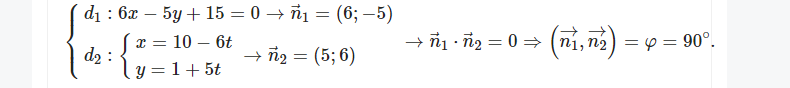 Tính góc tạo bởi hai đường thẳng d₁: 6x-5y+15=0 , d₂(pt tham số): x=10-6t , y=1+15t.