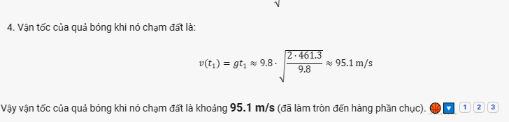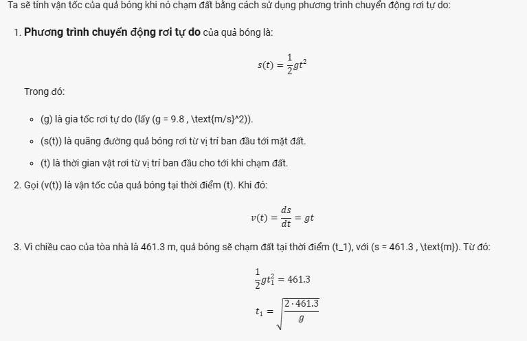 Một quả bóng được thả rơi tự do từ đài quan sát trên sân thượng của toà nhà Landmark 81 (Thành phố Hồ Chí Minh ) cao 461,3m xuống mặt đất, với phương trình chuyển động s ( t ) = 4 , 9 t ^2 Tính vận tốc của quả bóng khi nó chạm đất, bỏ qua sức cản không khí. (Đơn vị m/ s, kết quả gần đúng làm tròn đến hàng phần chục)