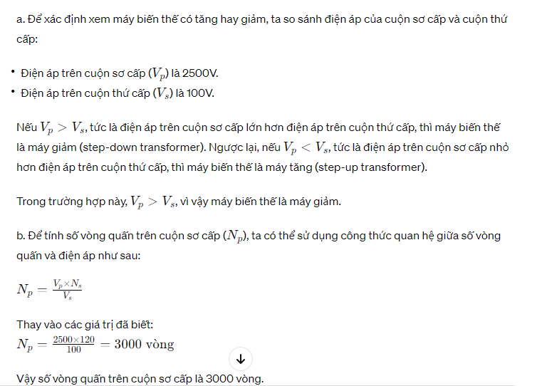 máy biến thế có hđt giữa 2 đầu cuộn sơ cấp và thứ cấp lần lượt là 2500V và 100V