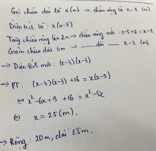 Một khu vườn hình chữ nhật có chiều dài hơn chiều rộng 5m. Nếu giảm chiều dài 3m và tăng chiều rộng 2m thì diện tích giảm 16m vuông. Tính các kích thước ban đầu của khu vườn