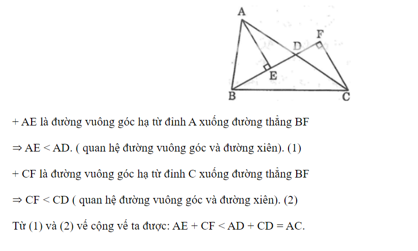 Bài 3: Cho AABC có B < C, D nằm giữa A,C (BD không vuông góc với AC). Gọi E, F làchân các đường vuông góc kẻ từ A, C đến đường thắng BD. So sánh AE + CF với AB vàAC.
