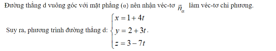 Đường thẳng d� đi qua điểm A(1;2;3)�(1;2;3) và vuông góc với mặt phẳng (α):4x+3y−7z+1=0(α):4�+3�−7�+1=0 sẽ có một vectơ chỉ phương là vectơ pháp tuyến của mặt phẳng (α)(α), tức là →n=(4;3;−7)�→=(4;3;−7).