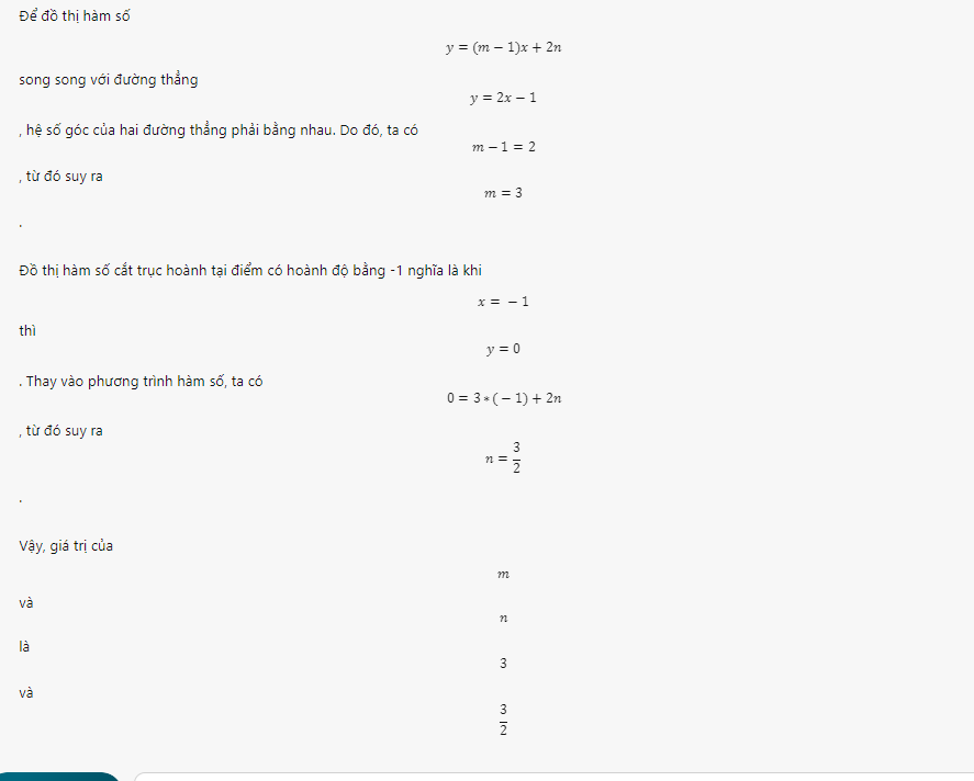 Vậy, giá trị của \( m \) và \( n \) để đồ thị hàm số \( y = (m-1)x + 2n \) song song với đường thẳng \( y = 2x - 1 \) và cắt trục hoành tại hoành độ bằng -1 là \( m = 3 \) và \( n = 1 \).