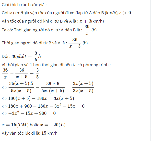 một người đi xe đạp từ A đến B dài 36km. vì phải có việc gấp để đến B trước dự tính là 36 phút nên người đó phải tắng vận tốc thêm 3km/h. tìm vận tố dự định